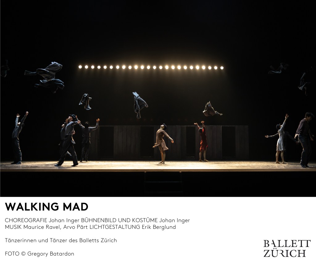 Dieses Stück habe ich leider noch nicht gesehen. Deshalb ein Zitat von der Webseite des Balletts Zürich: „Noch populärer als Strawinskys Stück wurde Maurice Ravels Boléro, den Bronislawa Nijinska erstmals 1928 in Paris auf die Bühne brachte. Auch der schwedische Choreograf Johan Inger setzt sich in seinem 2001 vom Nederlands Dans Theater uraufgeführten Ballett Walking Mad mit Ravels soghaftem Stück auseinander. Rund um eine riesige Holzwand inszeniert er ein spannungsgeladenes Beziehungsdrama, in dem die Tänzerinnen und Tänzer bizarr, surreal und clownesk agieren, bis das zunächst komödienhafte Treiben unaufhaltsam in den Abgrund führt.“