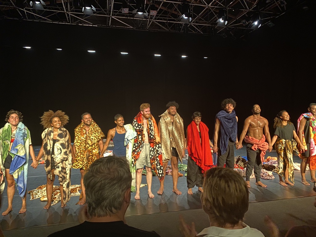 Die Vorstellung beginnt mit dem Ausrollen eines kunterbunten Teppichs aus Leintüchern – fast meditativ und in aller Stille legen sich die 11 Tänzerinnen und Tänzer den farbenfrohen Tanzboden aus. Danach verwandeln sich die tanzenden Menschen in unbeschreibliche Fantasiewesen, in dem sie sich die Tücher umbinden, sich darin verwickeln, die Enden verdrehen und alle (un)möglichen Formen entstehen lassen.