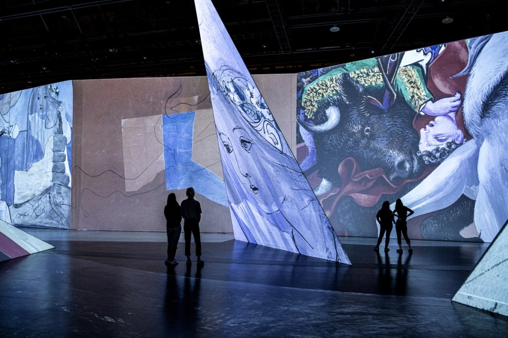 Eintauchen in die Bilderwelten von Pablo Picasso und Teil der Werke werden….. Was für eine Erfahrung! Über 200 Kunstwerke werden von 40 Hochleistungsprojektoren auf Wände, Boden und eigens dafür geschaffen Origami- Elemente wieder gegeben. Man muss es selbst gesehen haben.